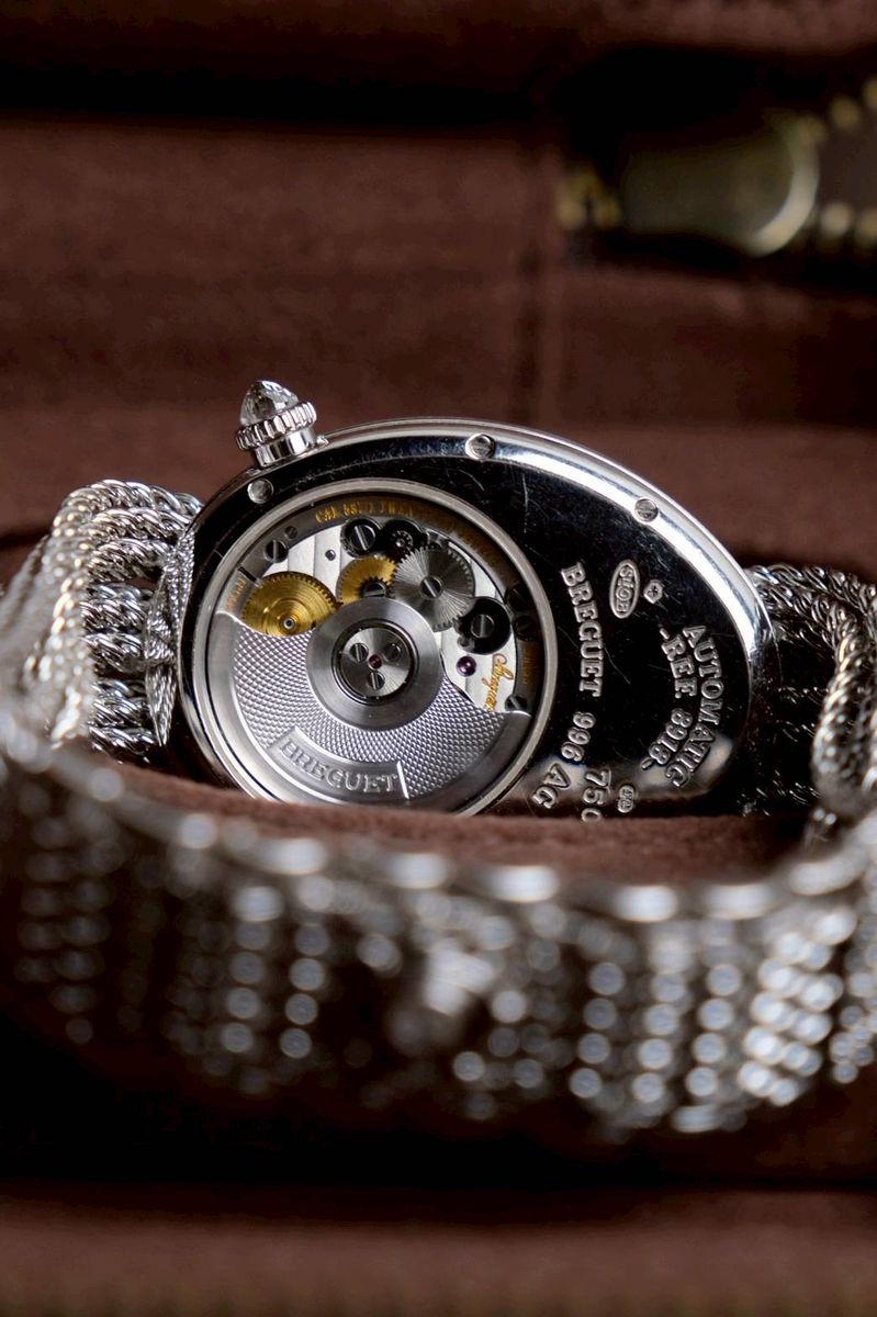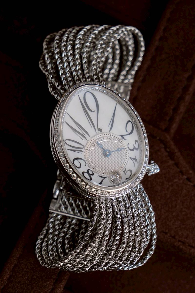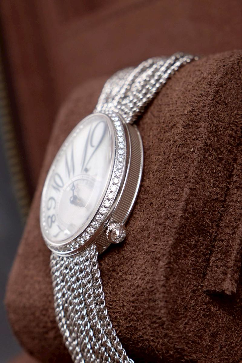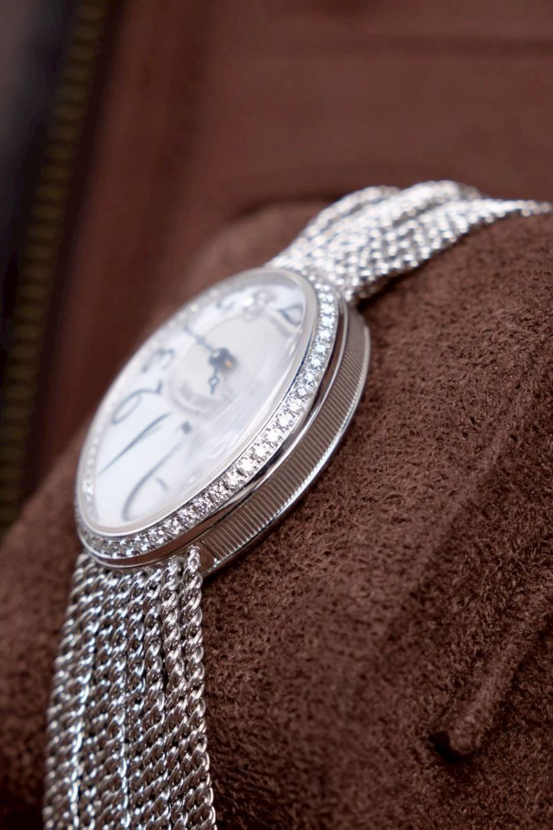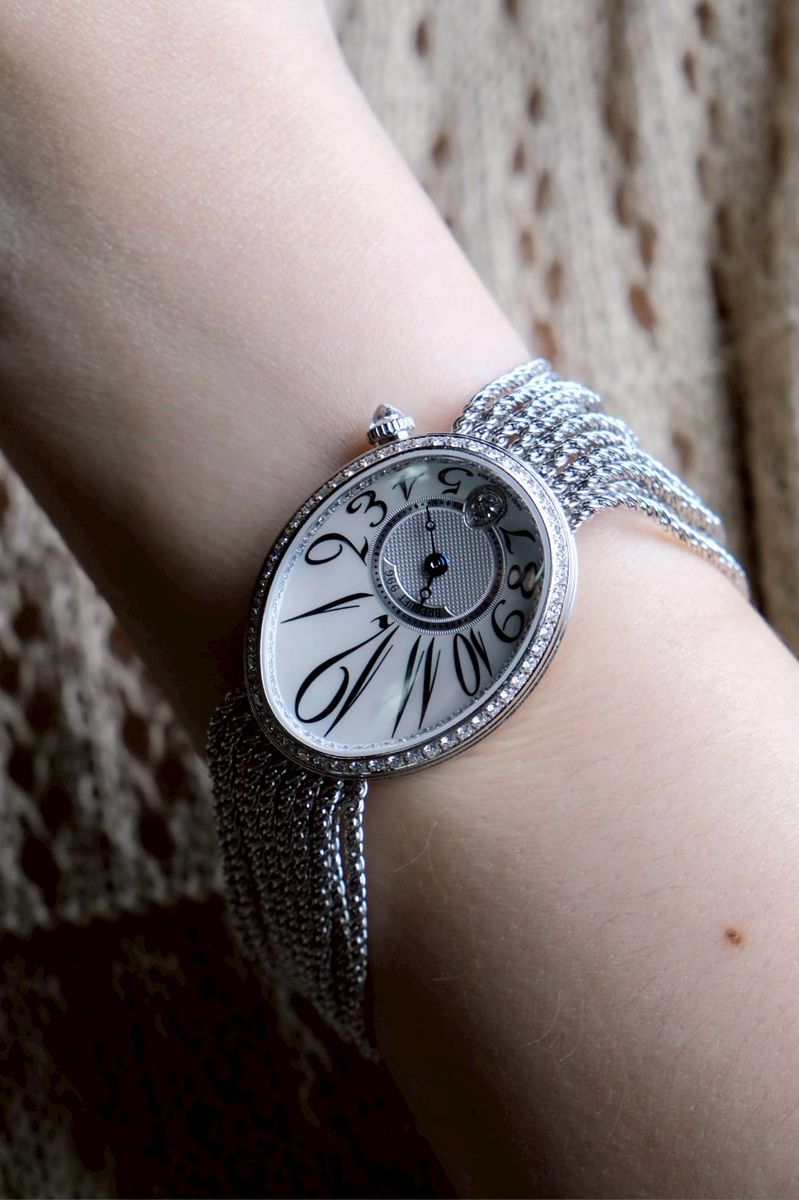 แรงบันดาลใจจากเรือนเวลาแรกของโลกสำหรับสุภาพสตรี Breguet ออกแบบนาฬิกาข้อมือเรือนแรกของโลกในปี 1812 ให้แก่ Caroline Murat – Queen of Naples และคอลเลคชั่น Reine de Naples คือการสืบทอดความงามเรือนเวลานั้นมาจนถึงปัจจุบัน ตัวเรือน 18K White Gold ขนาด 36.5 x 28.45 mm ขอบตัวเรือนและแหวนหน้าปัดประดับ เพชร Brilliant-Cut
