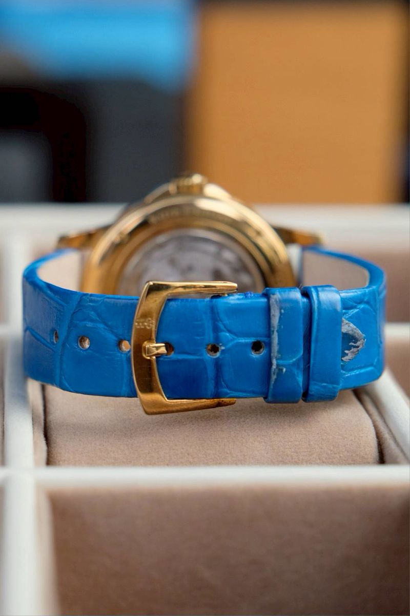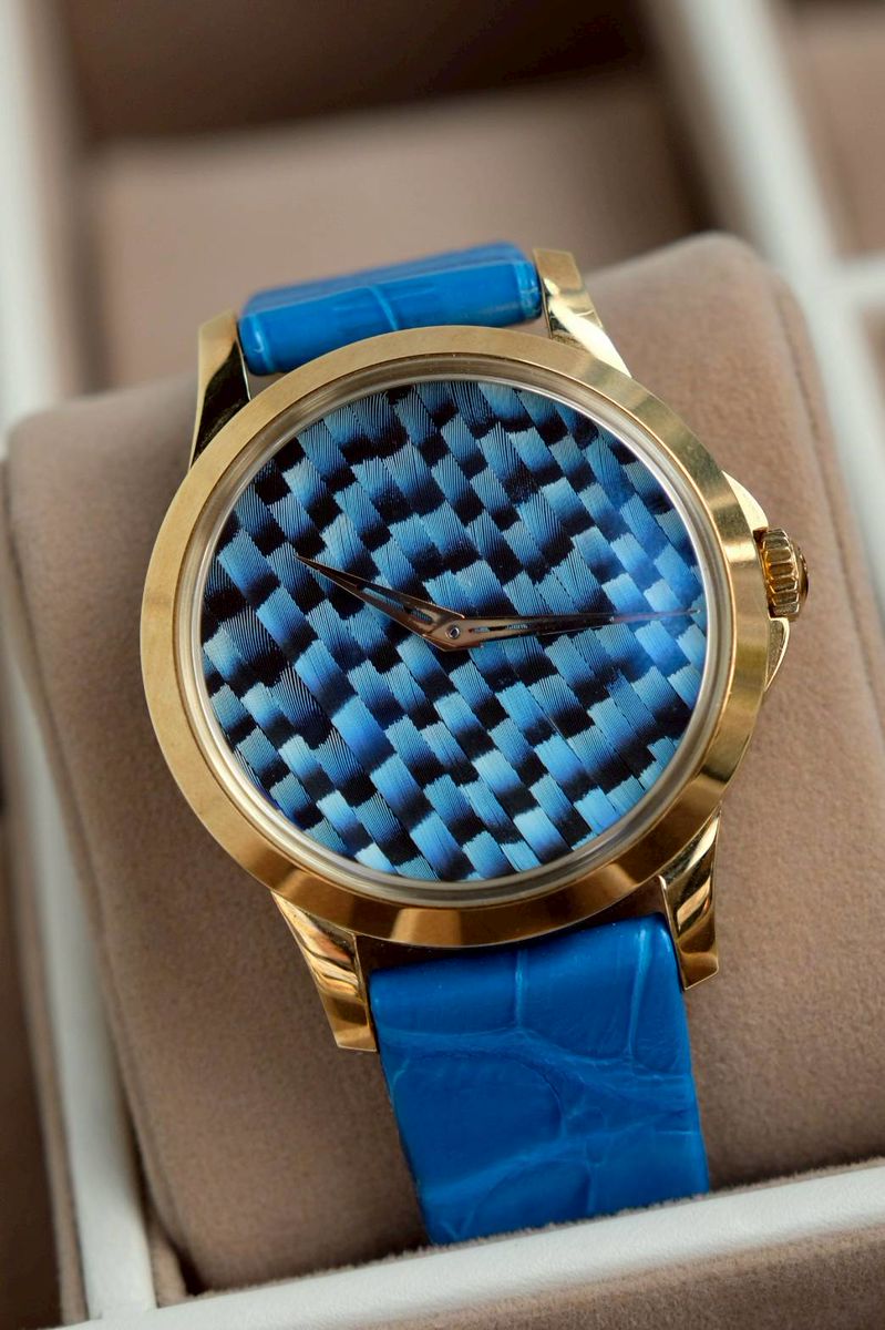 ขนาด 39mm หน้าปัดพิเศษทำจากขนนกยูง หายาก ผลิตน้อย เรือนทองคำ 18K Yellow Gold