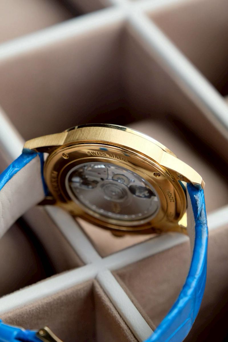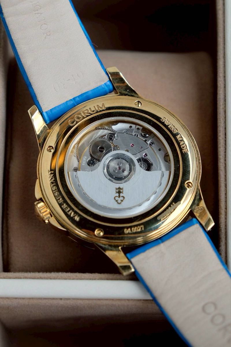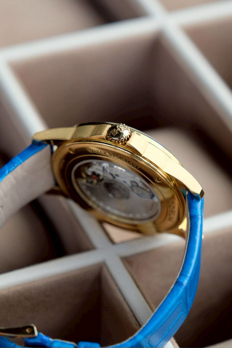หลังเปลือยเห็นกลไก เครื่องAutomatic สายหนังจระเข้สีฟ้า ตัดกับหน้าปัด มาแต่ตัวเรือนครับ