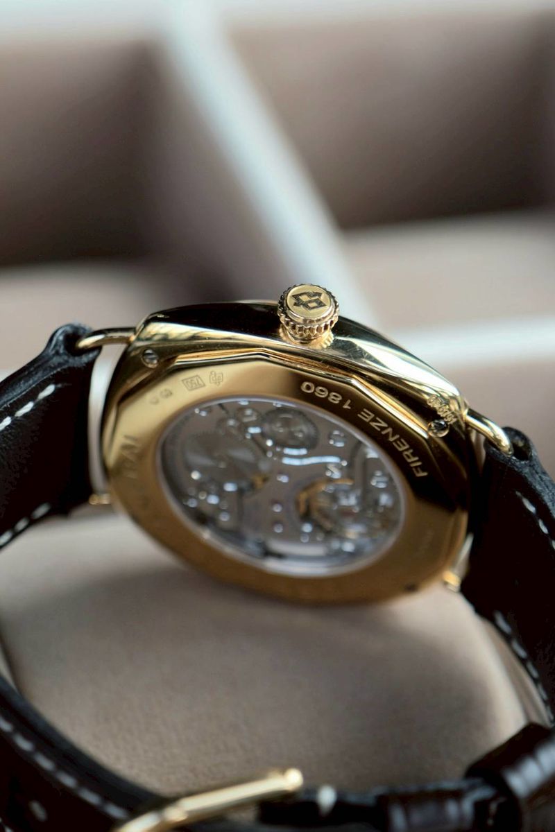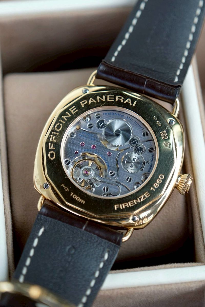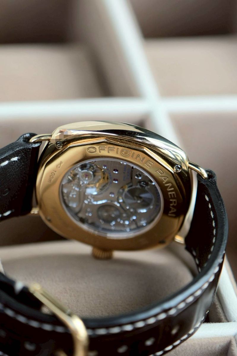 นาฬิกาข้อมือผู้ชายรุ่นพิเศษจากคอลเลกชัน Radiomir ที่มีการผลิตแบบ Limited Edition เพียงประมาณ 500 เรือนทั่วโลก เท่านั้น ขนาด 42 mm หน้าปัดสีน้ำตาล “tobacco” แบบ sandwich dial ตัวเรือน 18K Rose Gold หลังเปลือยโชว์กลไก เครื่องไขลาน มาตัวเปล่าครับ